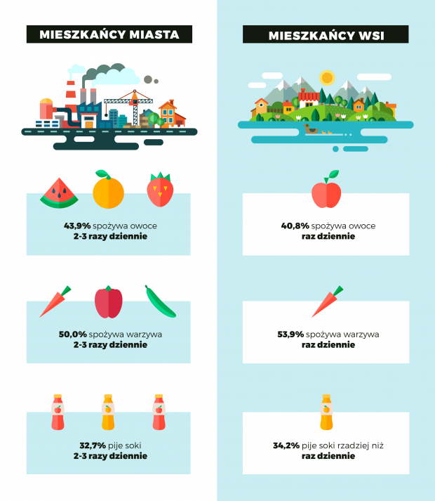 Z badań przeprowadzonych przez Instytut Badawczy Millward Brown wynika, że w aspekcie pozytywnych nawyków żywieniowych przodują mieszkańcy miast. Większość mieszkańców miast (43,9%) spożywa owoce 2-3 razy dziennie, podczas gdy większość mieszkańców wsi (40,8% badanych) spożywa owoce raz dziennie. Podobnie jest w kwestii spożycia warzyw – mieszkańcy miast (50%) spożywają je 2-3 razy dziennie, natomiast mieszkańcy wsi (53,9%) tylko raz dziennie. Tymczasem Światowa Organizacja Zdrowia zaleca spożywanie minimum 5 porcji warzyw i owoców w ciągu dnia. Jedną porcję może zastąpić sok owocowy, warzywny lub owocowo-warzywny.
